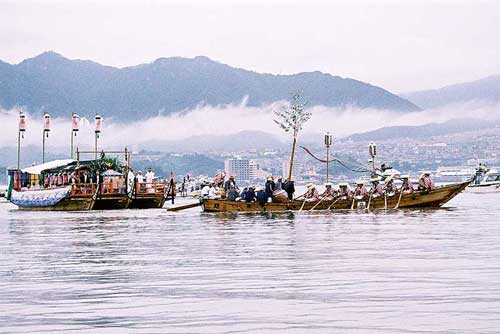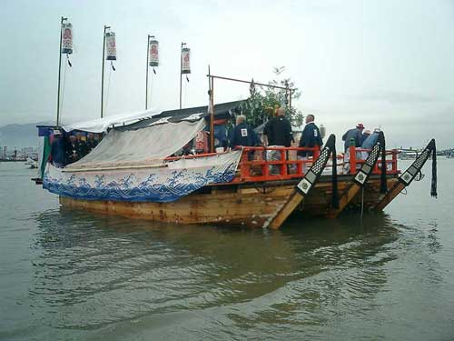 | 大鳥居沖で準備中の御座舟(管弦船)先頭に三女神のご神体を入れた神輿があります。和船3隻をつないで組み立てられます(2004新造)。旧暦6/15組み立て式 | |