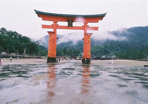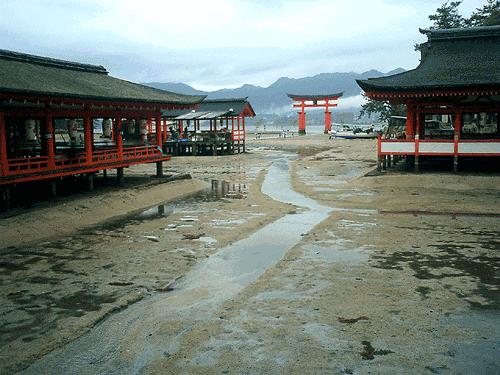 | 午後5時半くらいに大鳥居前を出発直後の写真(添付)です。 雅楽を演奏後、大鳥居前で大きく3回左回りに回った後、対岸の摂社「地御前神社(じごぜんじんじゃ)」に向かいますが、途中「火建岩(ほたていわ)」で日が暮れるのを待ち、地御前神社に入ります。 地御前神社前でも雅楽を演奏し、同じように3回回った後、厳島神社北側の「長浜神社(ながはまじんじゃ)」に戻ってきます。ここでは皆が提灯行列でお迎えします。ここでも雅楽を演奏の後、3回回って厳島神社南側の「大元神社(おおもとじんじゃ)」に向かい、同じことを繰り返し、最後に大鳥居をくぐって「客神社(まろうどじんじゃ)」を経て、本殿にご神体が戻るのは0時近くになります。 |