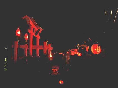 | 地御前神社を出た管弦船は最初に長浜神社に到着します。21:00ごろ ここでは参列者は提灯行列でお迎えします。 長浜神社の御神火をたいまつに移しその火を消防団の皆さんが配られた提灯に火をつけて回ります。 船頭さんが喜ぶようにとみんなで提灯を振ってお出迎えです。鳥居の前では神主さんと巫女さんが待っています。 |