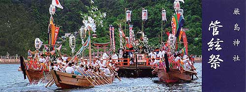 夕刻から夜半にかけて三艘の引き舟に曳かれ美しく飾り立てた御座船(これも三艘だて 添付右)で管弦(三管、三絃、三鼓)を演奏しつつ御摂社(厳島対岸)の地御前神社、戻って厳島の長浜神社、大元神社を巡拝し御神慮をお慰めするさまは、まさに平安絵巻を見るようです。 全体の流れ 旧暦6/11 御州堀 旧暦6/15 組み立て式 旧暦6/16 試乗式 旧暦6/17 管弦祭 16:00 発れん祭御 17:00 本社出発 18:00 大鳥居沖出発 20:20 地御前神社着 21:00 長浜神社着 22:30 大元神社着 23:10 火焼前着 24:00 御本社帰着 *気象条件等によりかなり変動があります。 |